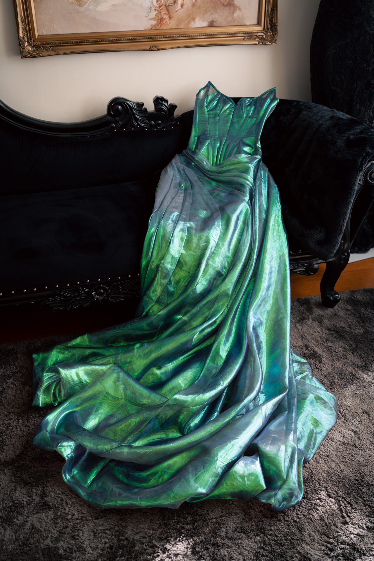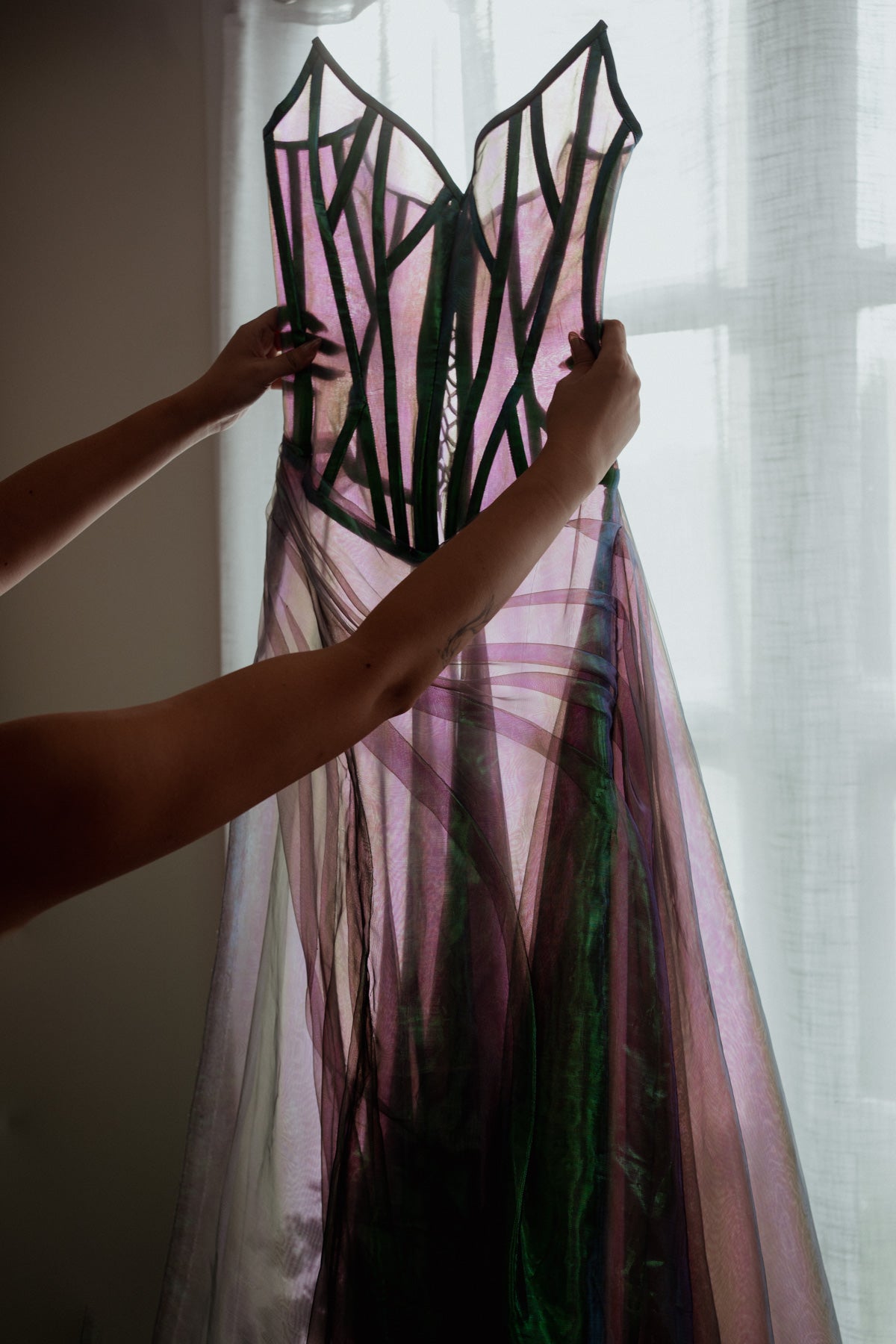 Crafted from iridescent organza that shifts colour in the light, this fairy dress has a soft, luminous feel. It features a structured corseted bodice for support and a draped skirt with a slit for fluid movement. A removable bodice drape allows the neckline to be styled in multiple ways.