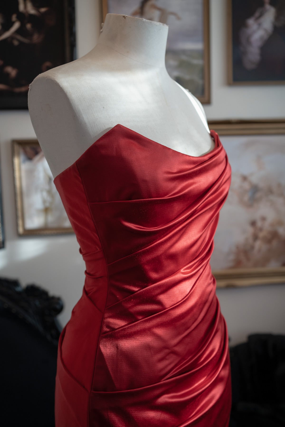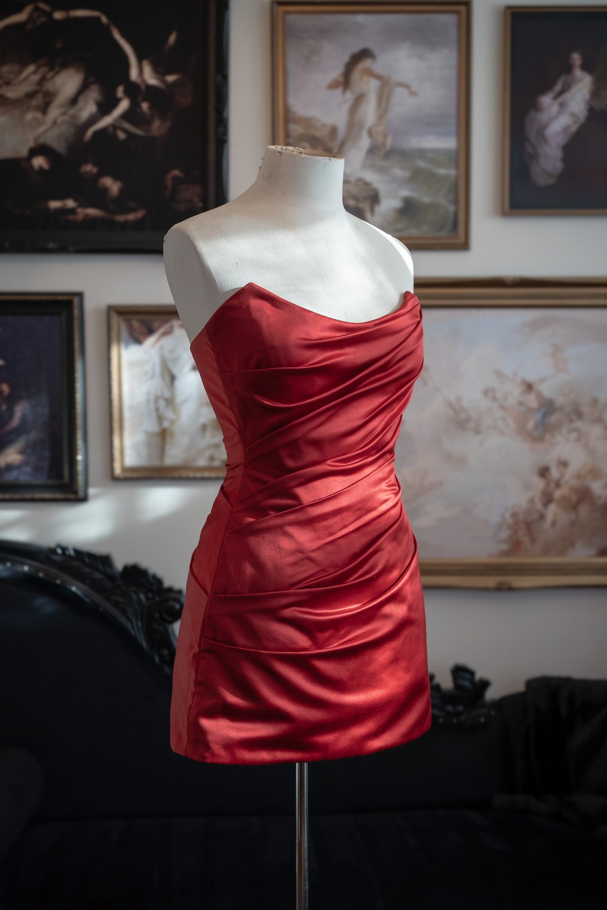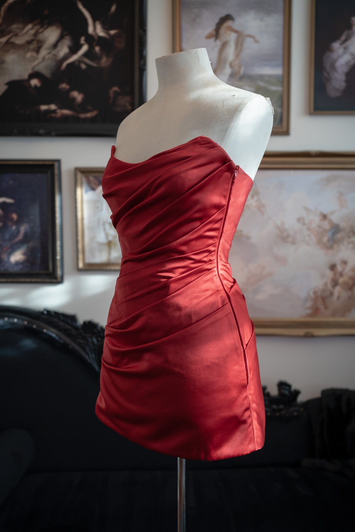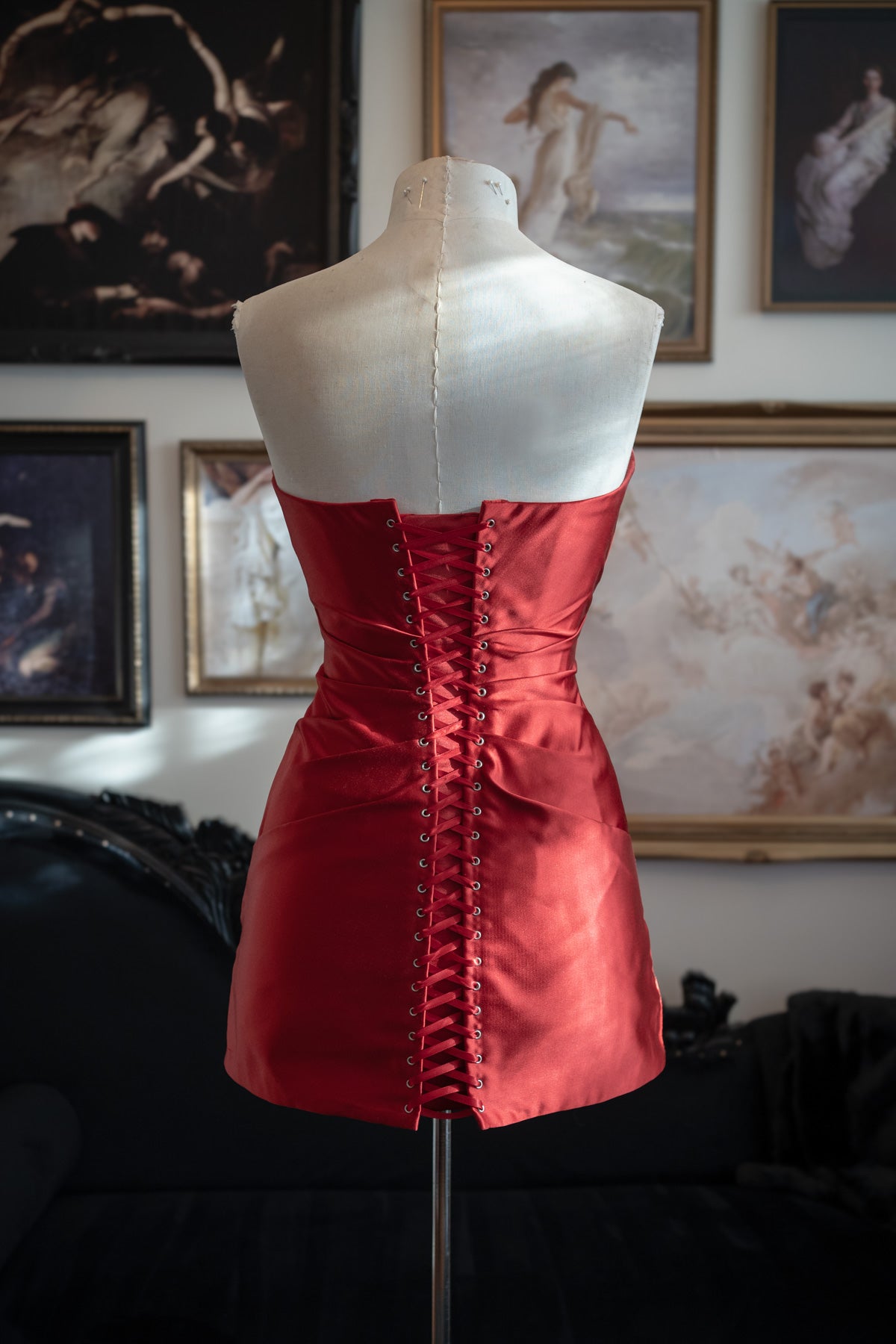 A structured duchess satin mini dress featuring organic, hand-draped detailing, making each piece uniquely individual. Built with a corset-style inner construction for support. It includes a full-length lace-up panel for adjustable fit and added design, as well as a side zip for ease of wear.