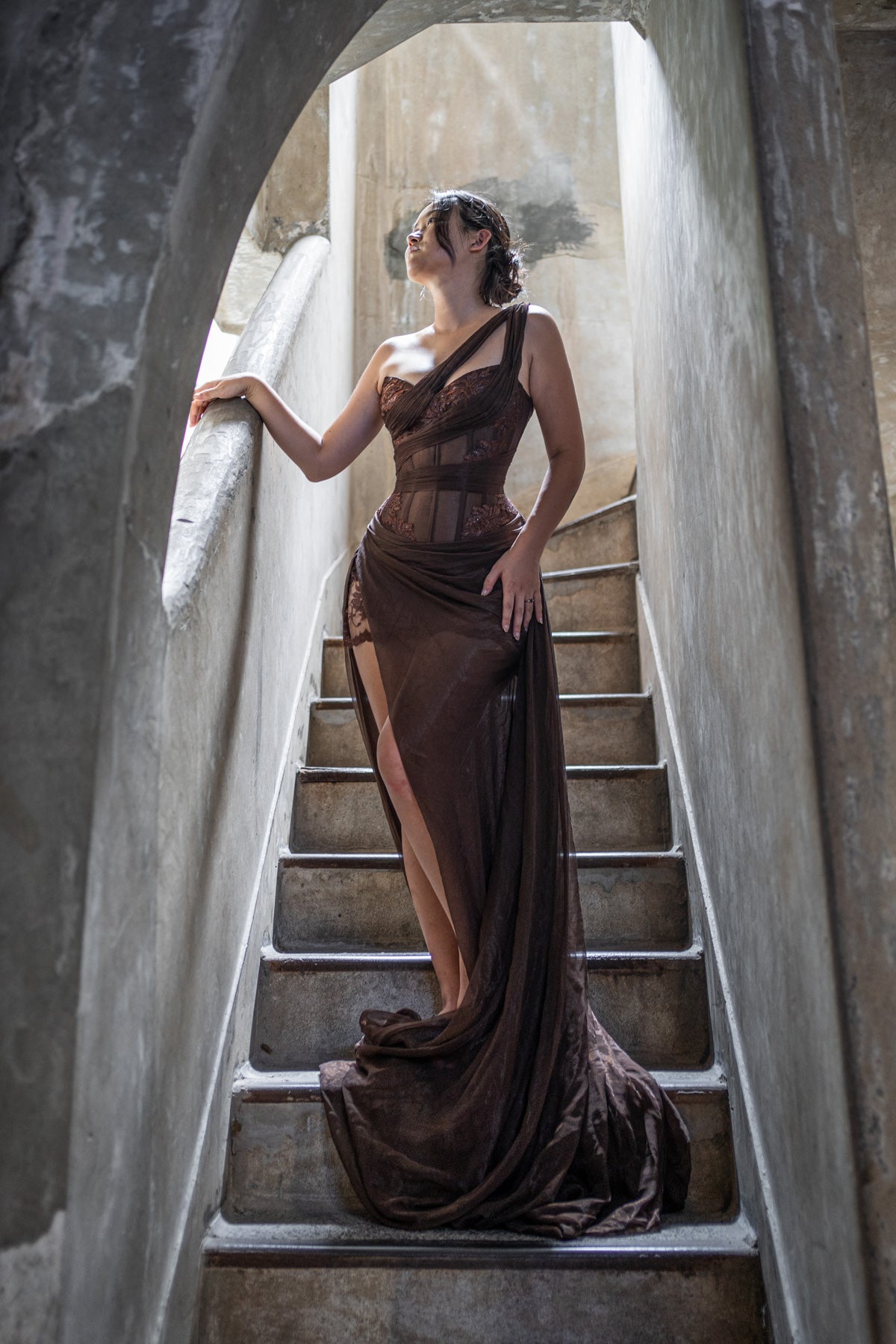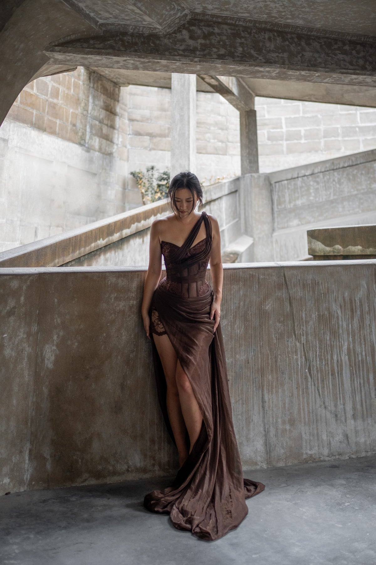 Featuring silk chiffon pleated asymmetrically over a sheer corset finished with lurex lace details for a touch of shine. The draped, flowy skirt creates an effortless, ethereal silhouette.